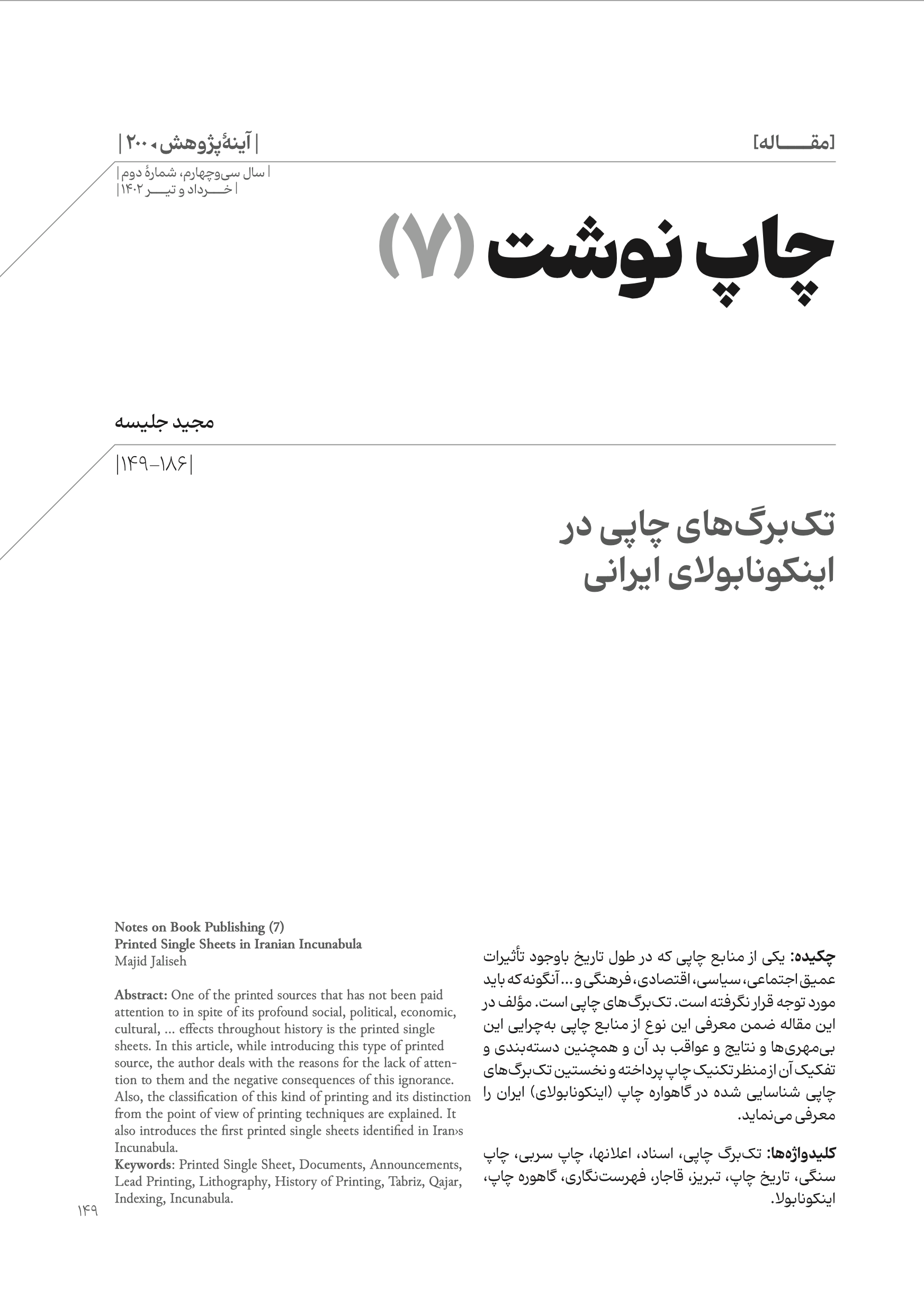 یکی از منابع چاپی که در طول تاریخ باوجود تأثیرات عمیق اجتماعی، سیاسی، اقتصادی، فرهنگی و … آنگونه که باید مورد توجه قرار نگرفته است. تکبرگهای چاپی است. مؤلف در این مقاله ضمن معرفی این نوع از منابع چاپی بهچرایی این بیمهریها و نتایج و عواقب بد آن و همچنین دستهبندی و تفکیک آن از منظر تکنیک چاپ پرداخته و نخستین تکبرگهای چاپی شناسایی شده در گاهواره چاپ (اینکونابولای) ایران را معرفی مینماید.