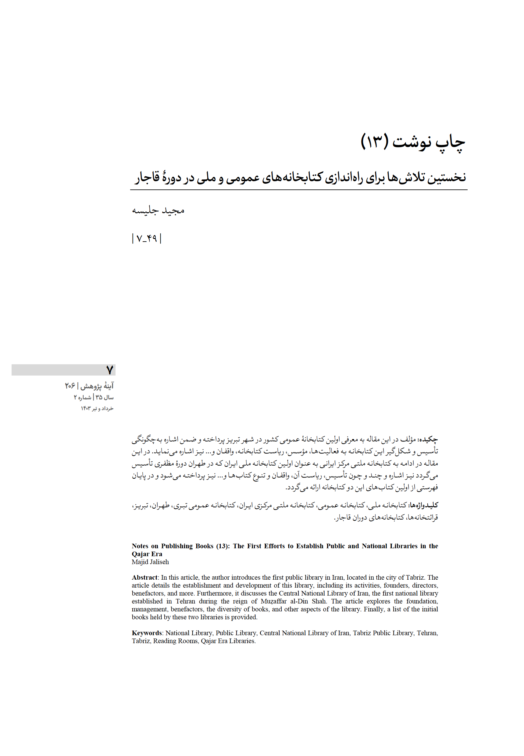 مؤلف در این مقاله به معرفی اولین کتابخانۀ عمومی کشور در شهر تبریز پرداخته و ضمن اشاره به چگونگی تأسیس و شکلگیری این کتابخانه به فعالیتها، مؤسس، ریاست کتابخانه، واقفان و … نیز اشاره مینماید. در این مقاله در ادامه به کتابخانۀ ملتی مرکز ایرانی به عنوان اولین کتابخانۀ ملی ایران که در طهران دورۀ مظفری تأسیس میگردد نیز اشاره و چند و چون تأسیس، ریاست آن، واقفان و تنوع کتابها و … نیز پرداخته میشود و در پایان فهرستی از اولین کتابهای این دو کتابخانه ارائه میگردد.