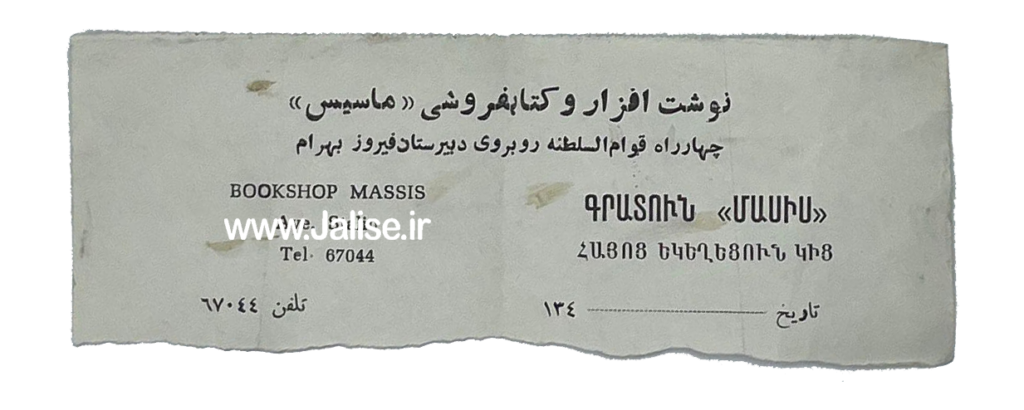 آنچه از همین سربرگ مستفاد میشود، اینست که این کتابفروشی در چهار راه قوام السلطنه روبروی دبیرستان فیروز بهرام بوده است. کتابفروشی که نامش و چاپ این نام به انگلیسی و زبان ارمنی حکایت از این دارد که احتمالا هم مؤسسش ارمنی است و هم کتابهایی که در آن ارائه میشده حداقل بخشی از آن مربوط به ارامنه بوده است.